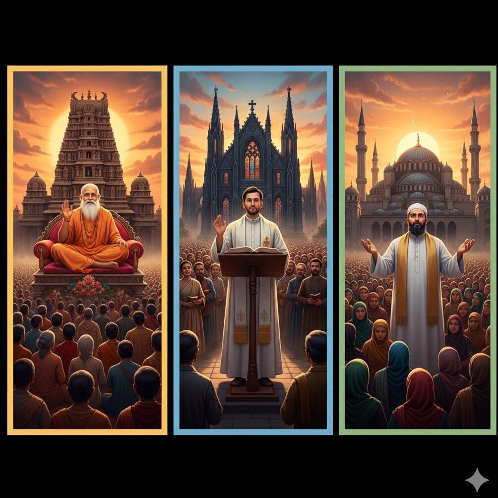 “நாங்கள் கடவுளால் தேர்ந்தெடுக்கப்பட்டவர்கள்; இந்த உலகுக்கு நாங்கள் தான் வழி காட்ட வந்தோம்” என்று மதங்களும் ஆர்ப்பரிக்கின்றனர். மூடநம்பிக்கை பேச்சுகள் மூலம் மக்களை அச்சப்படுத்தியும், தங்கள் வழியை மட்டுமே நம்பச் செய்தும், அவர்களைத் தங்கள் கட்டுப்பாட்டிற்குள் கொண்டு வருகிறார்கள்.